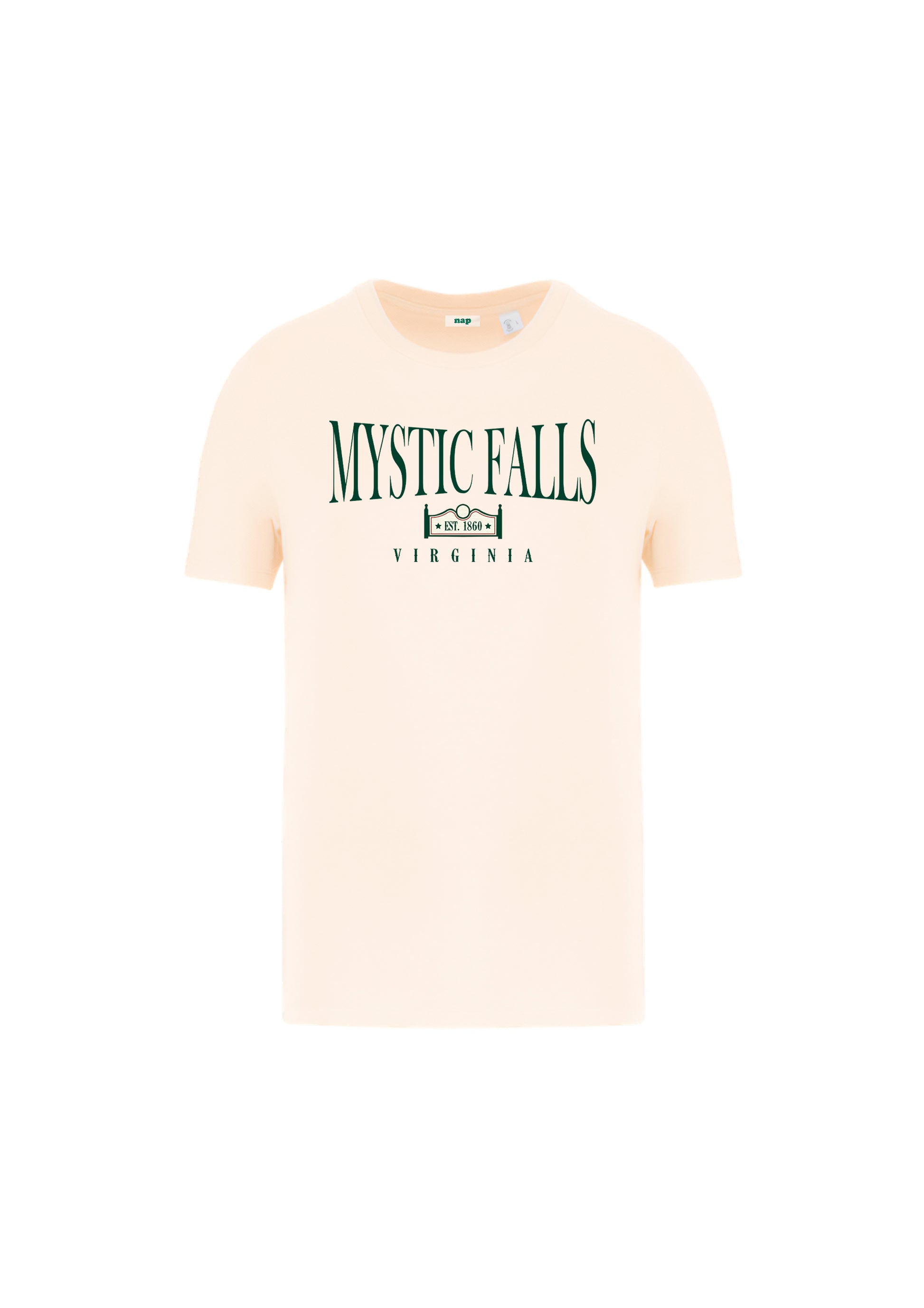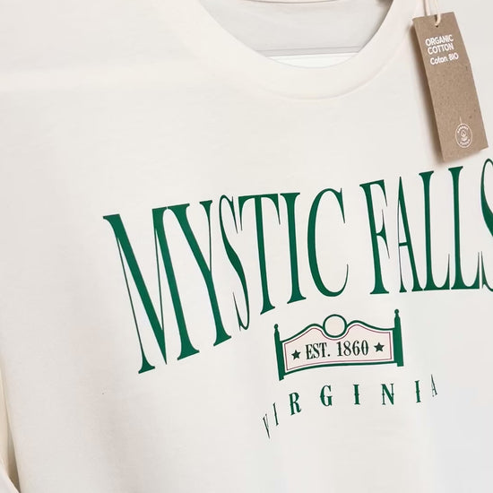 Camiseta con diseño estampado ''Mystic Falls'', inspirado en el pueblo ficticio donde se desarrolla la serie The Vampire Diaries (Crónicas Vampíricas en español).