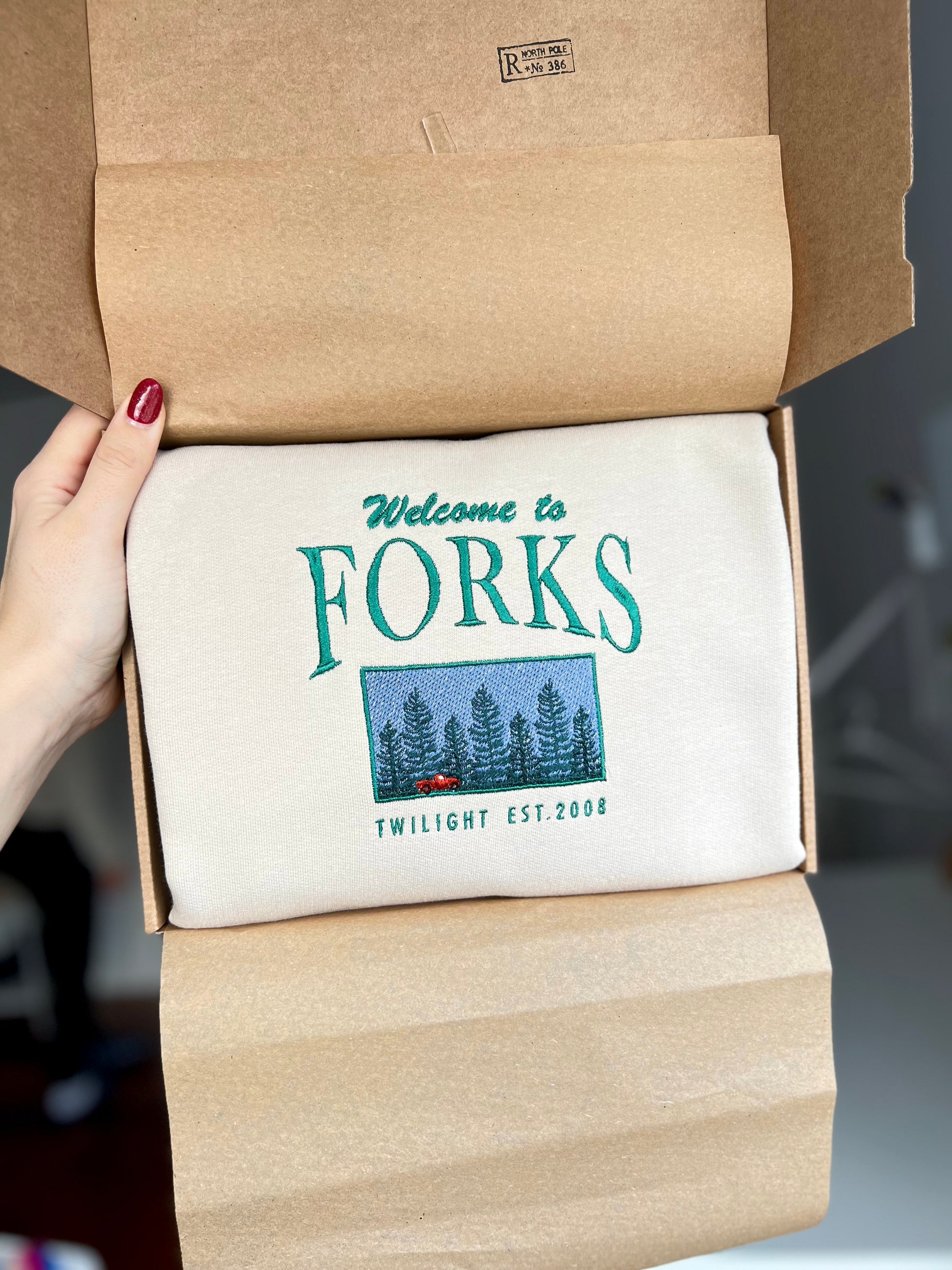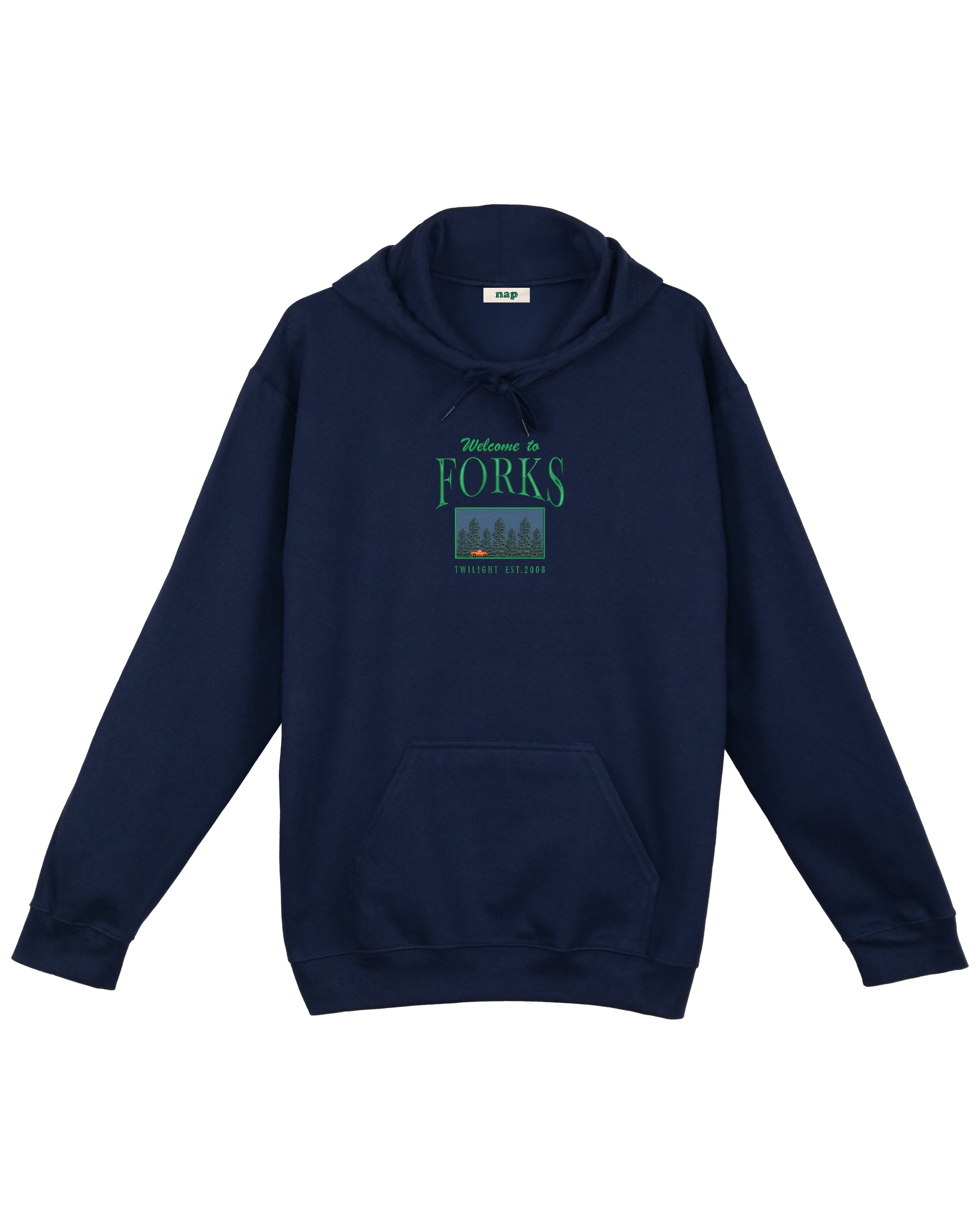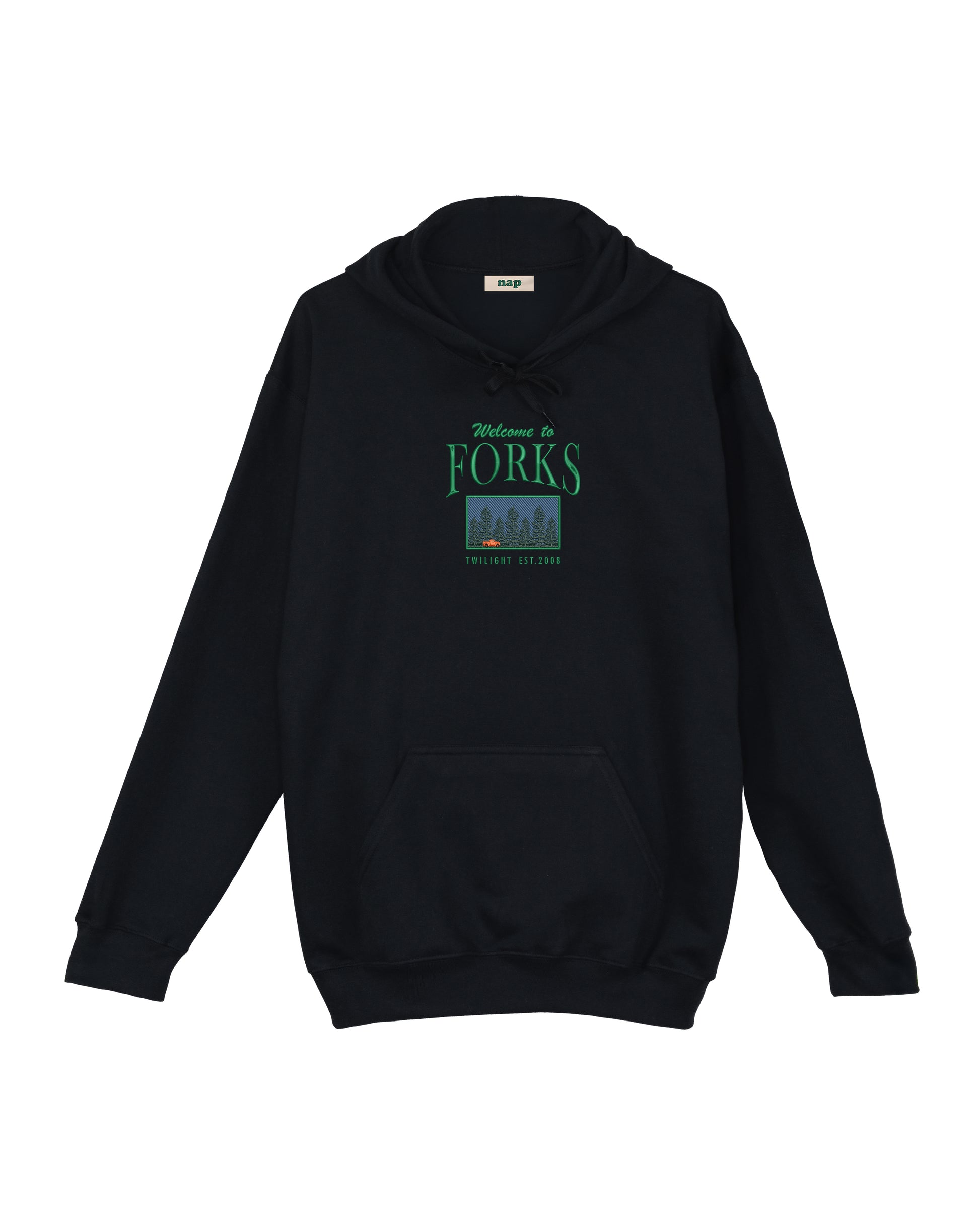 Sudadera con diseño bordado ''Forks'', inspirado en el pueblo de Estados Unidos donde se desarrolla principalmente la saga Crepúsculo.