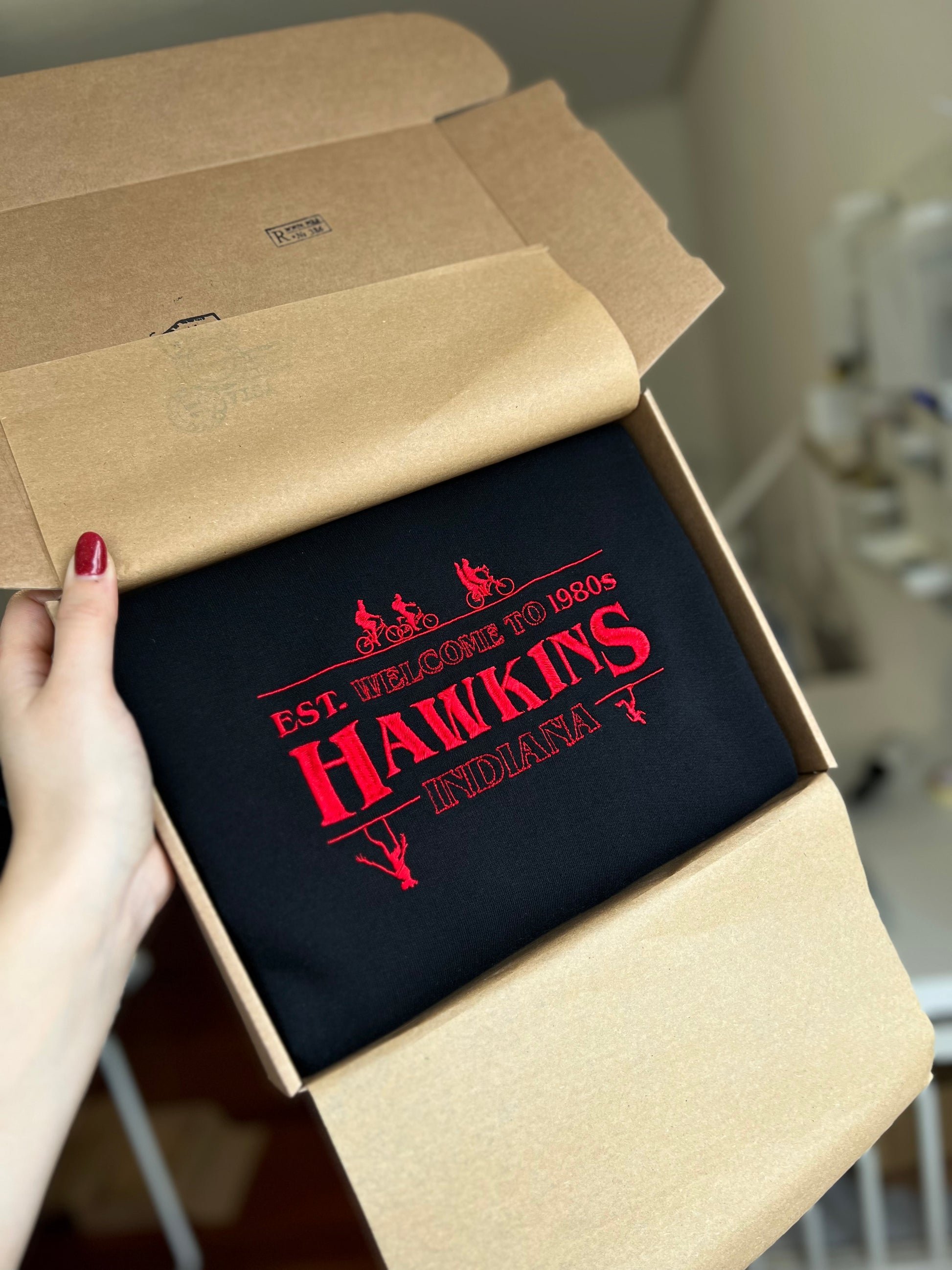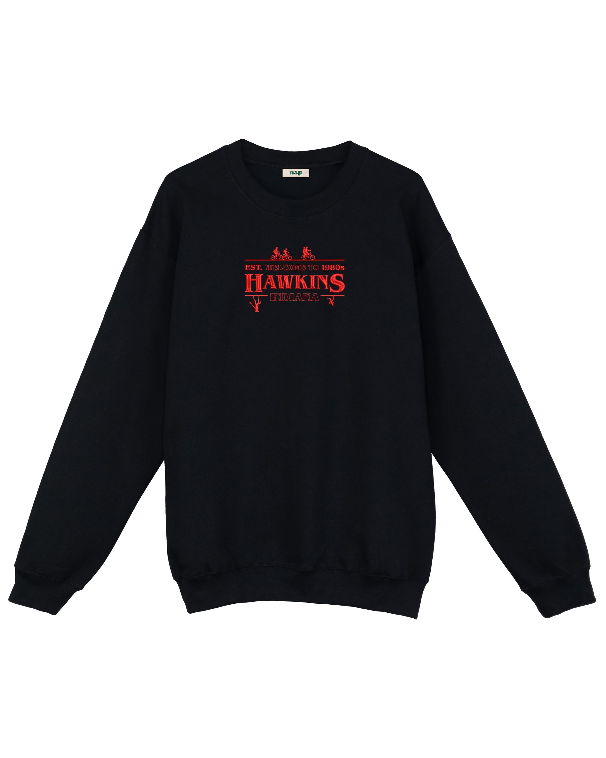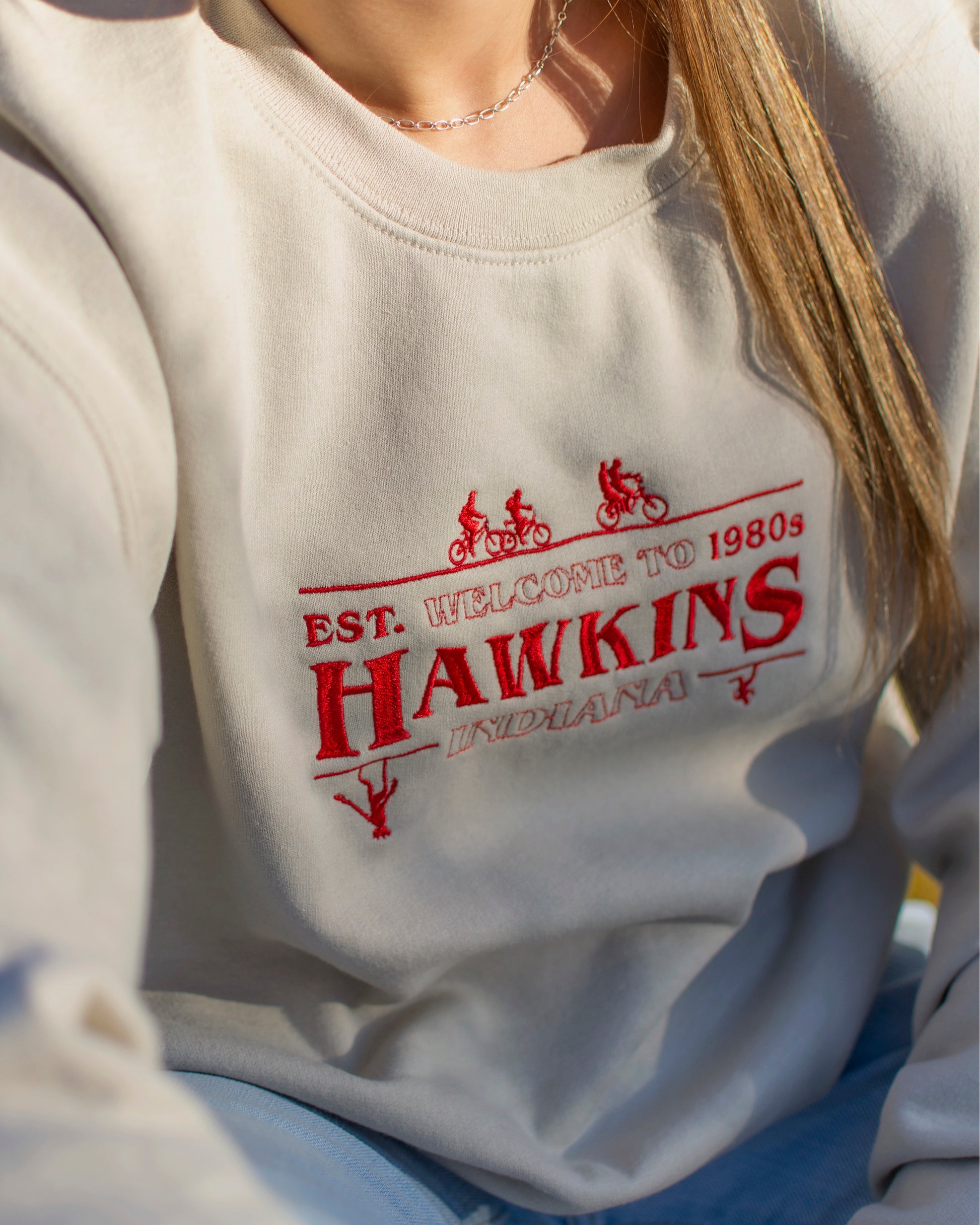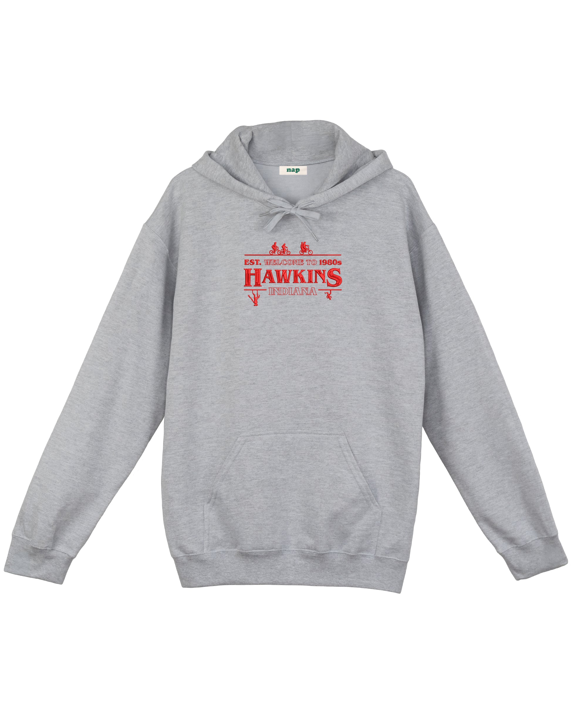 Sudadera con diseño bordado ''Hawkins'', el pueblo ficticio del estado de Indiana donde se desarrolla la serie Stranger Things.