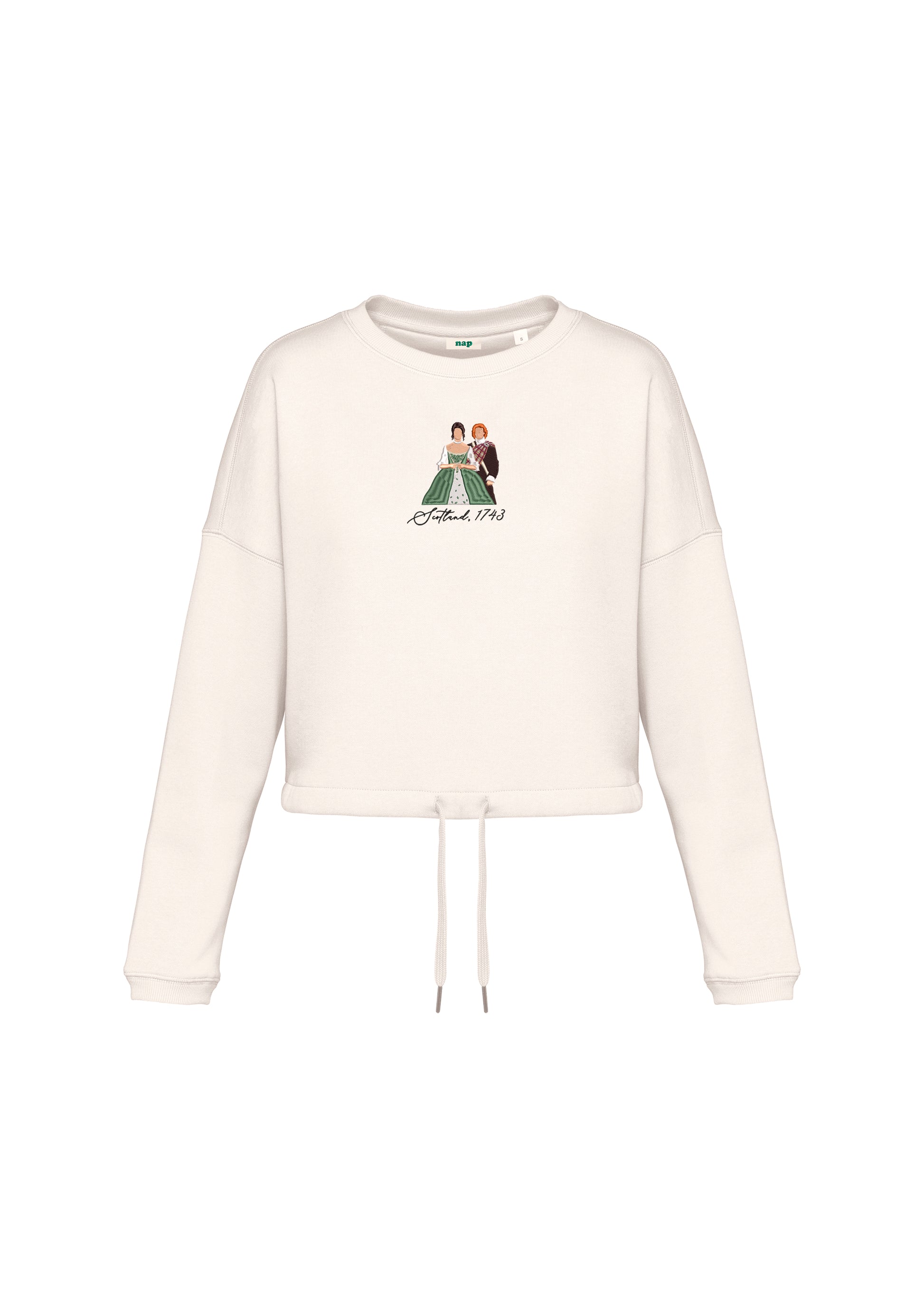 Composición y tallaje: Sudadera de mujer, de cuello redondo y cropped. Corte oversize con hombros caídos. Talla de la XS a la XL. 280 g/m², con una composición de 65% algodón orgánico y 35% poliéster. Guía de tallas disponible en las imágenes del producto así como en la sección ‘’nuestra guía de tallas’’.