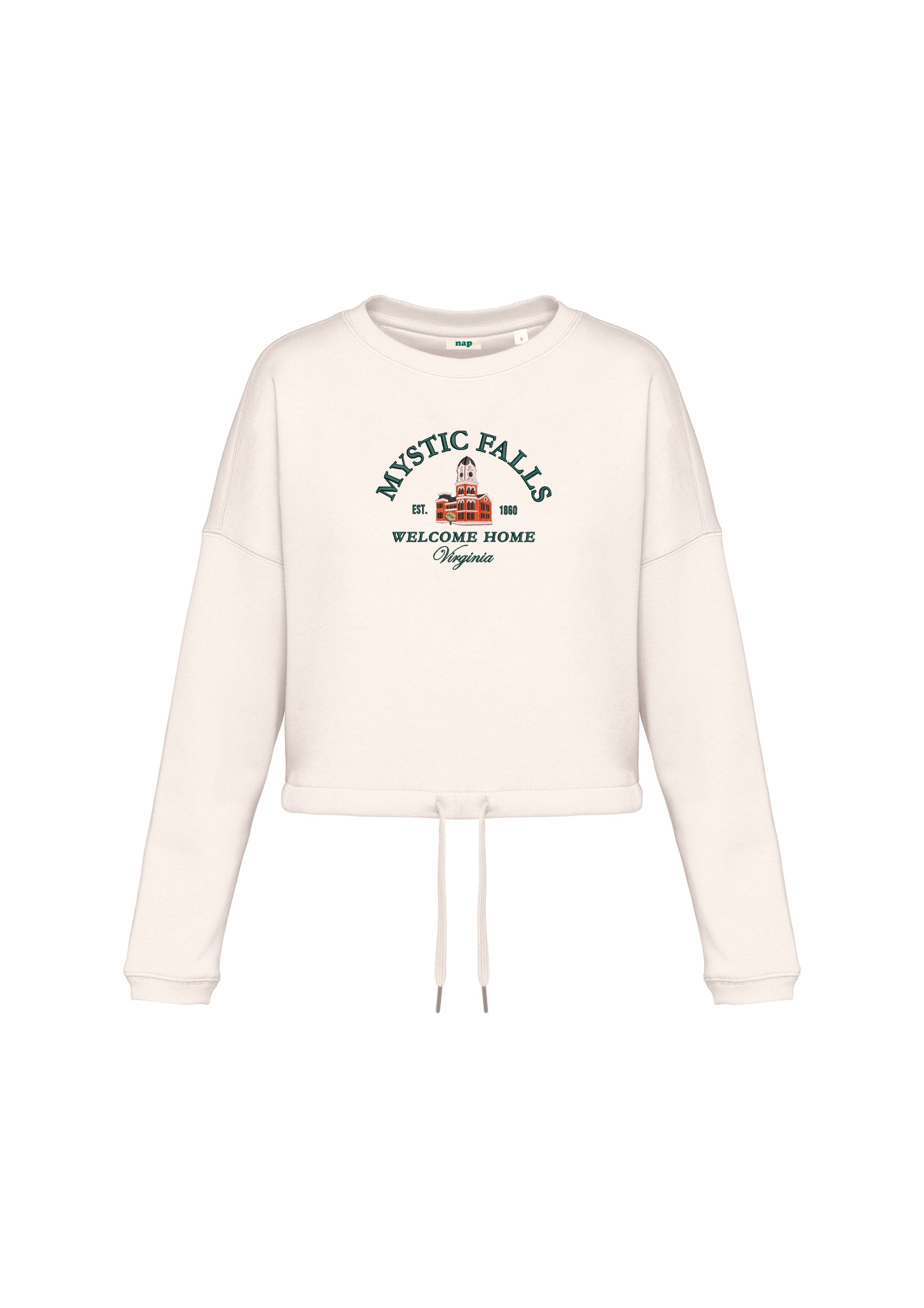 Sudadera cropped Mystic Falls Welcome Home bordada