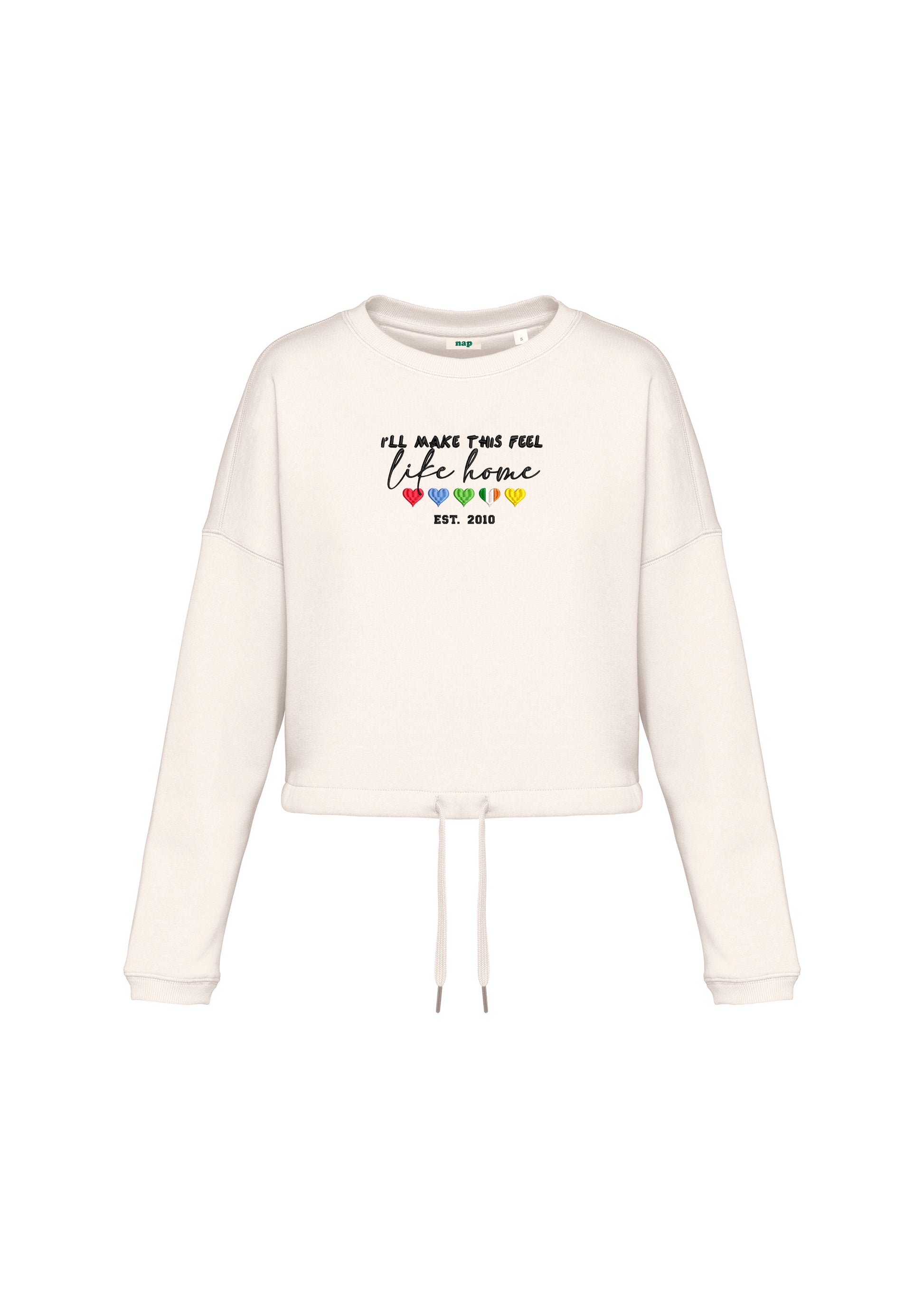 Composición y tallaje: Sudadera de mujer, de cuello redondo y cropped. Corte oversize con hombros caídos. Talla de la XS a la XL. 280 g/m², con una composición de 65% algodón orgánico y 35% poliéster. Guía de tallas disponible en las imágenes del producto así como en la sección ‘’nuestra guía de tallas’’.