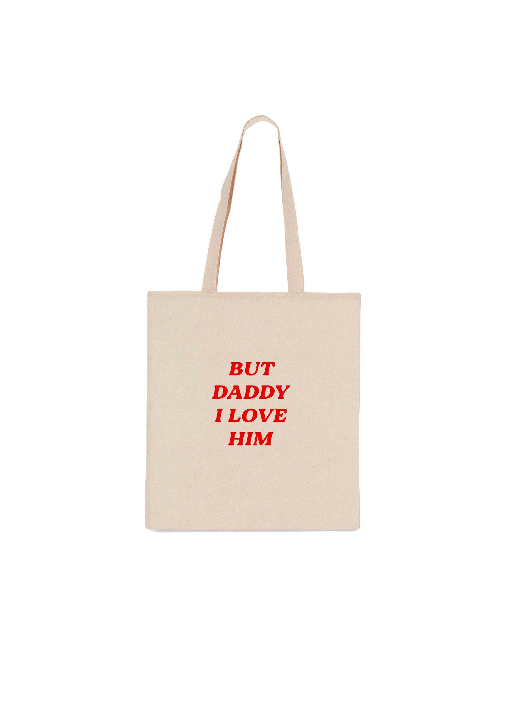 Tote Bag con diseño estampado ''But Daddy I Love Him'', inspirado en la icónica camiseta que llevó el artista Harry Styles; al mismo tiempo que en la canción que recibe el mismo nombre del álbum ''The Torture Poets Department'' de la artista Taylor Swift.
